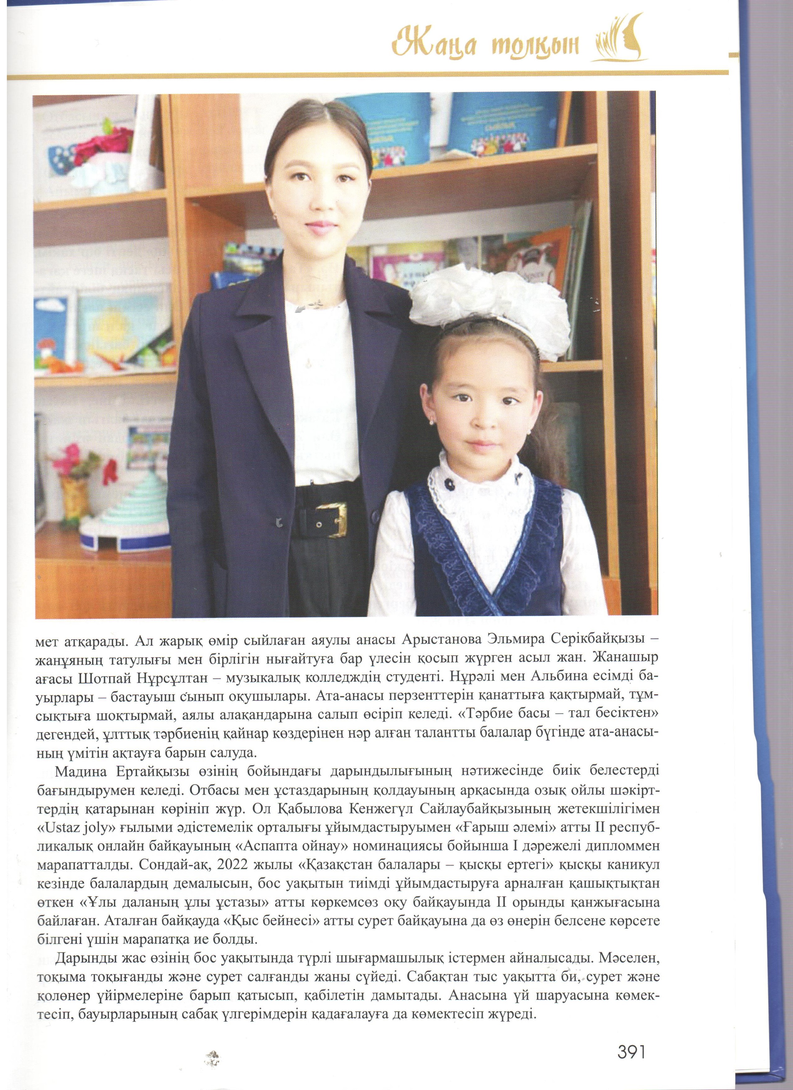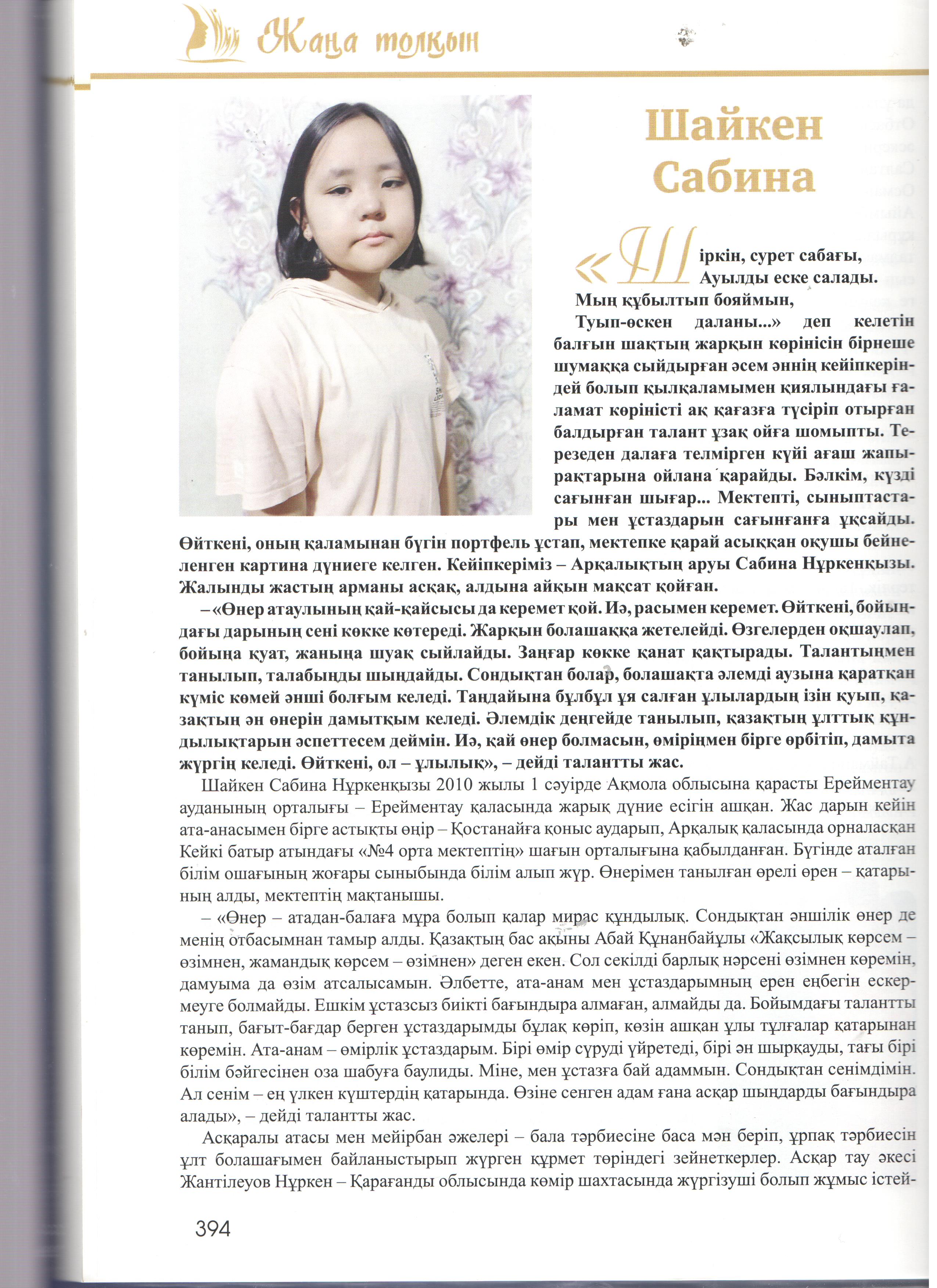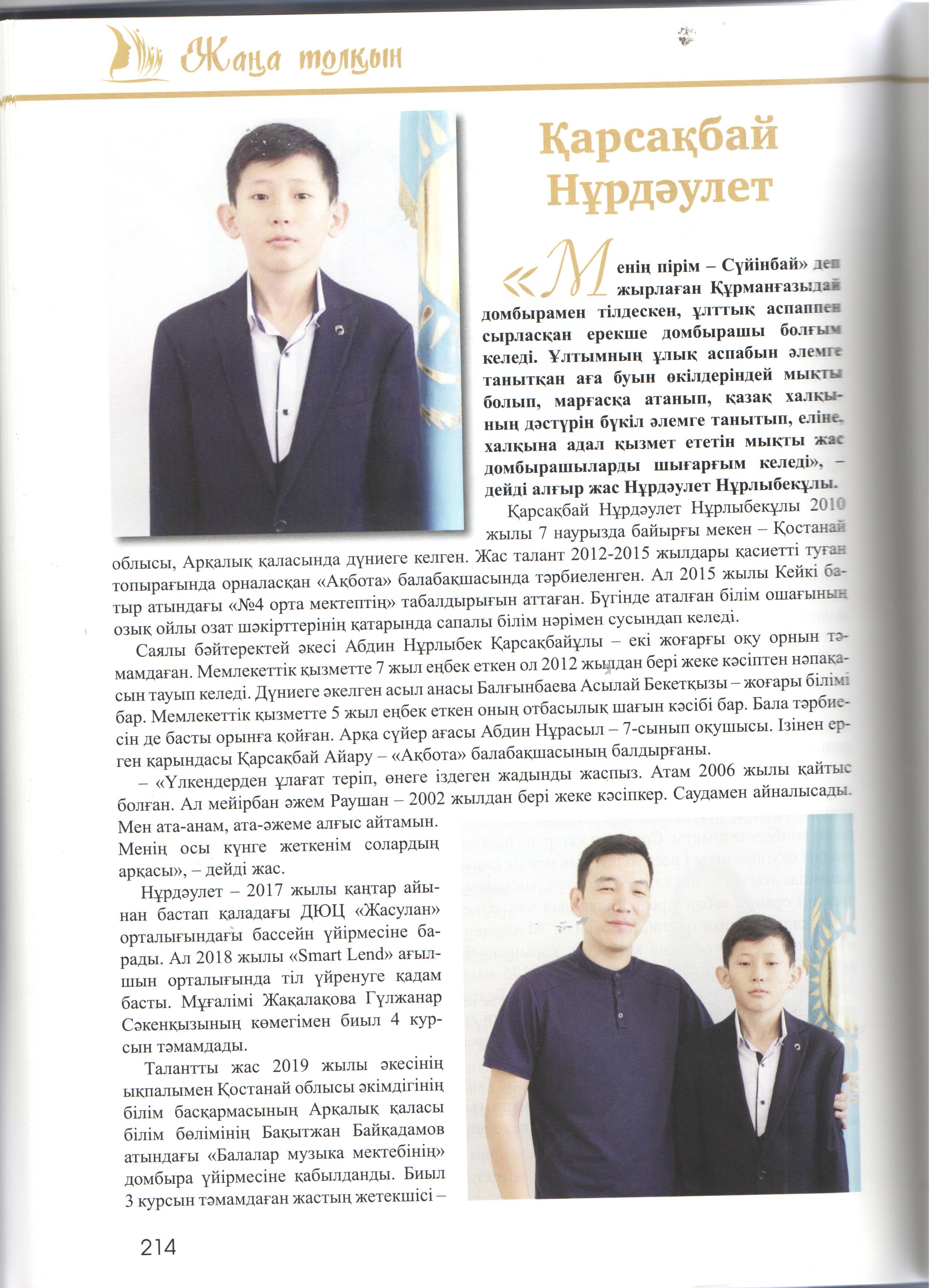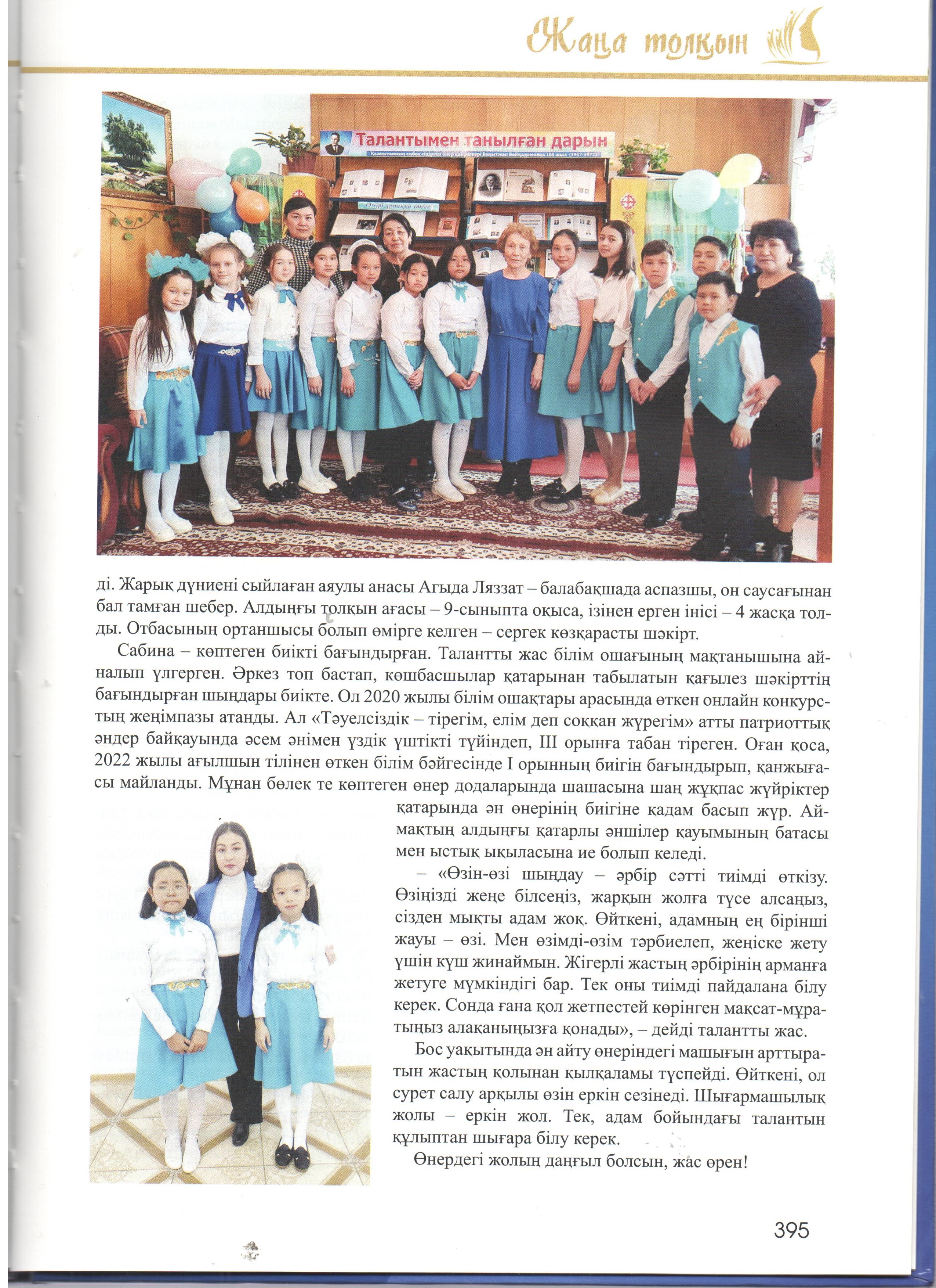 Кітап-энциклопедиядада жас таланттардың отбасы, білім алып жүрген мектебі, жеткен жетістіктері мен қосымша айналысатын сүйікті істері жөнінде ақпарат берілген. Сондай жастайынан өнерді жанына серік еткісі келетін кітаптың бетіне жарыққа шыққан біздің мектебіміздің өнерлі өрендерің атап айтар болсақ: