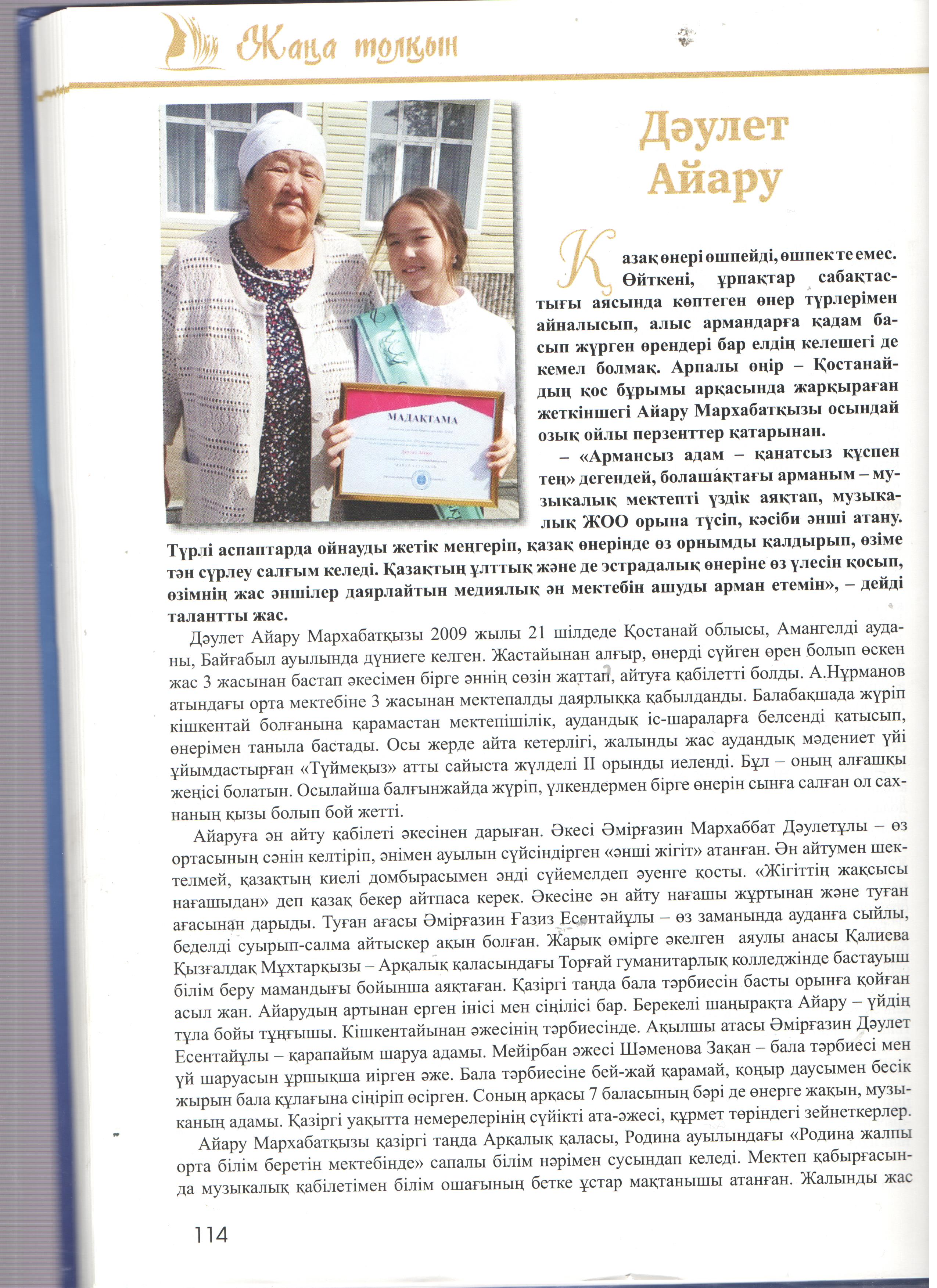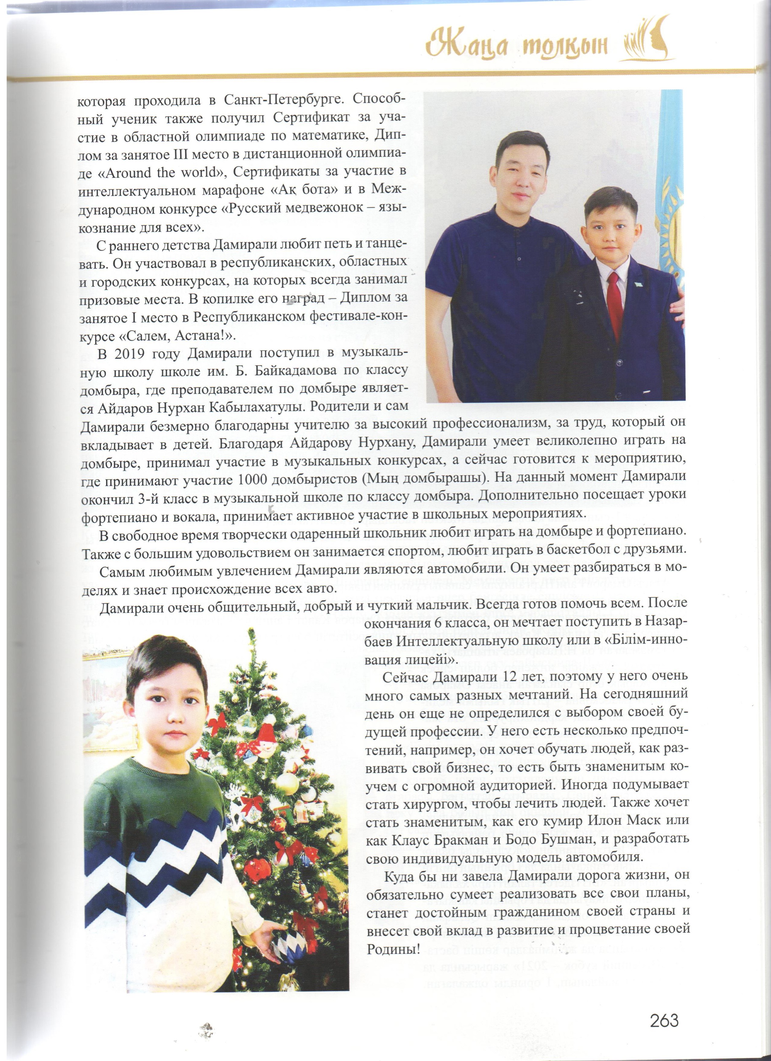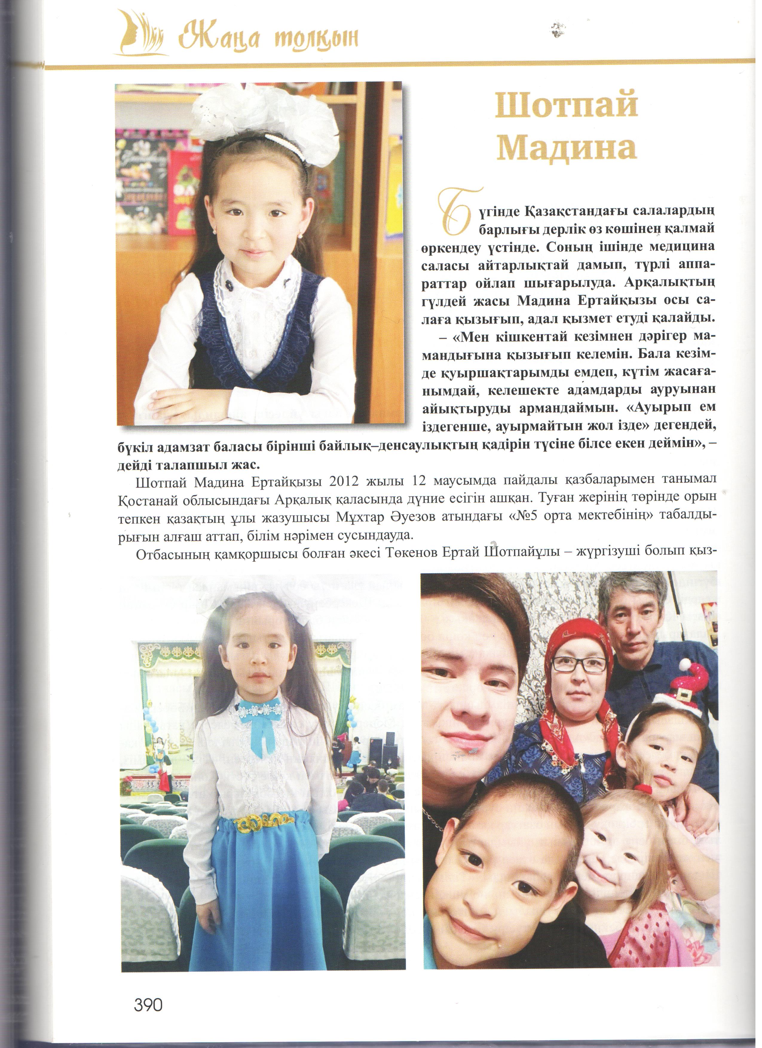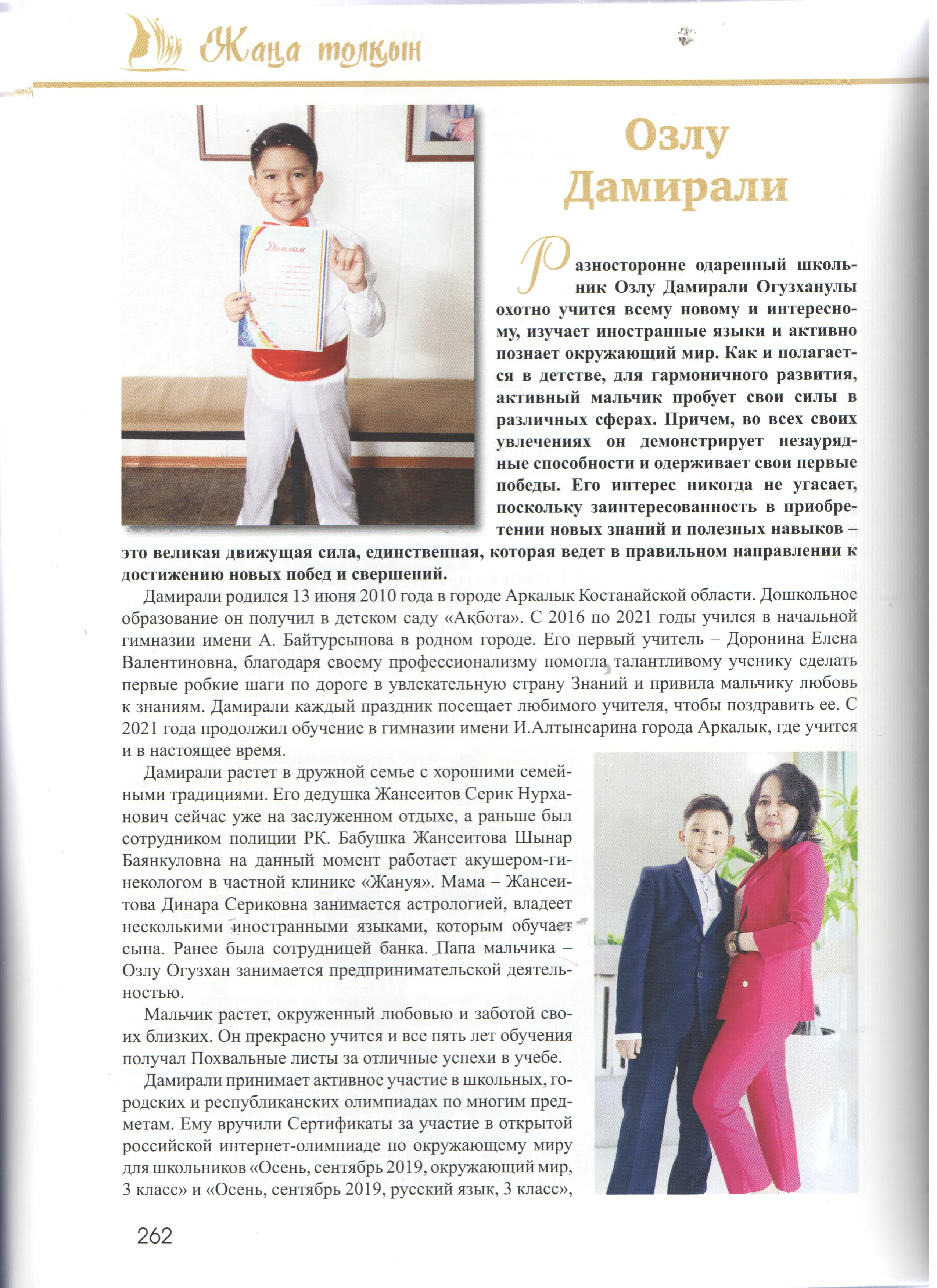 Кітап-энциклопедиядада жас таланттардың отбасы, білім алып жүрген мектебі, жеткен жетістіктері мен қосымша айналысатын сүйікті істері жөнінде ақпарат берілген. Сондай жастайынан өнерді жанына серік еткісі келетін кітаптың бетіне жарыққа шыққан біздің мектебіміздің өнерлі өрендерің атап айтар болсақ: