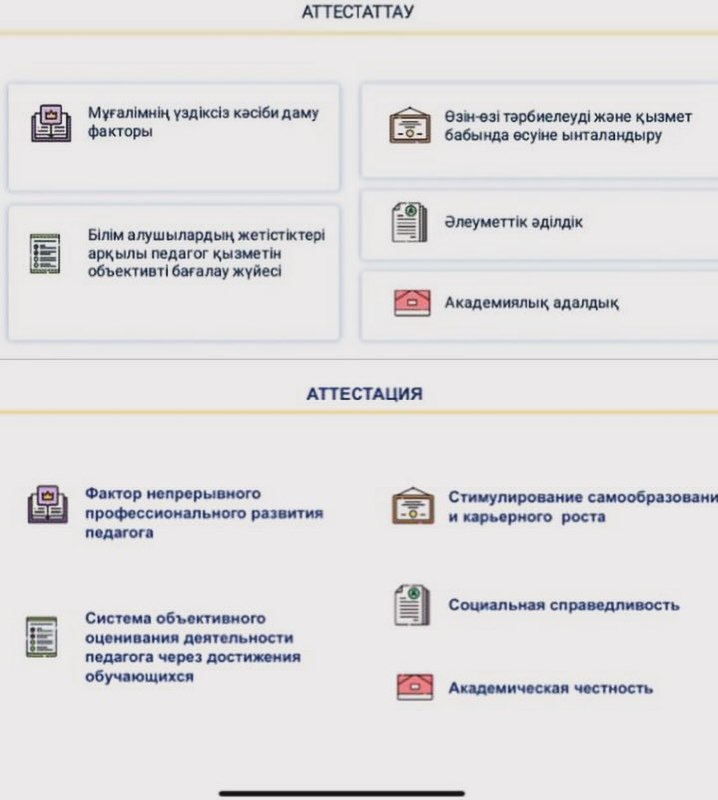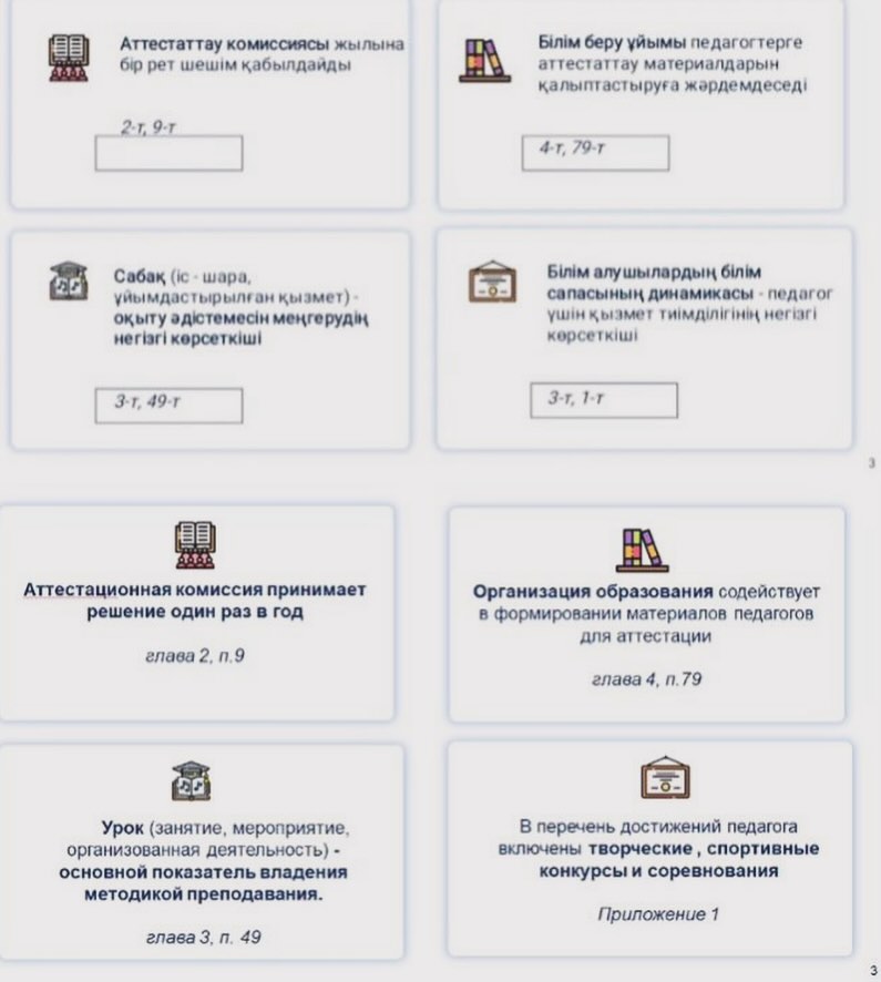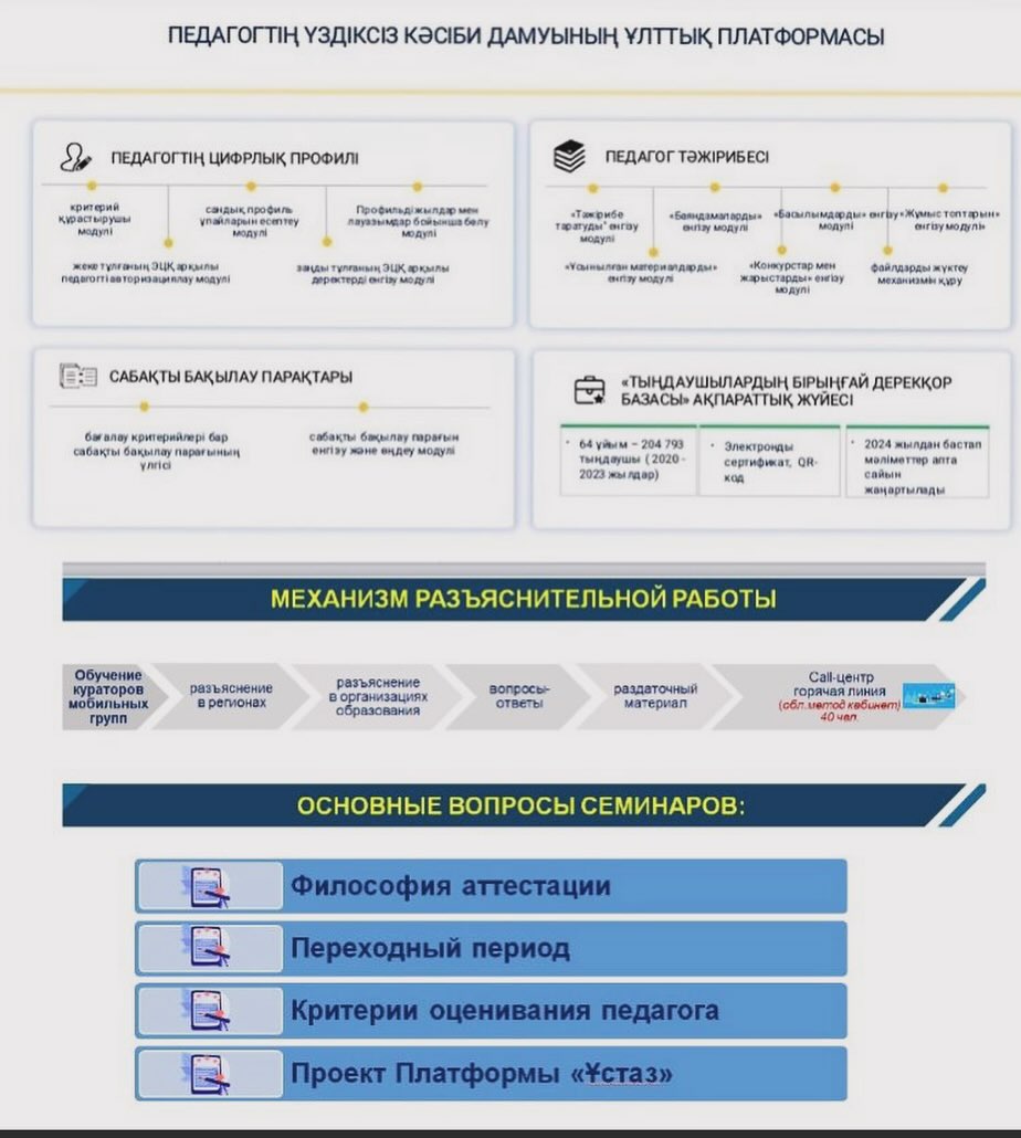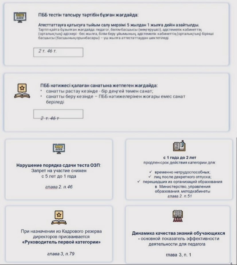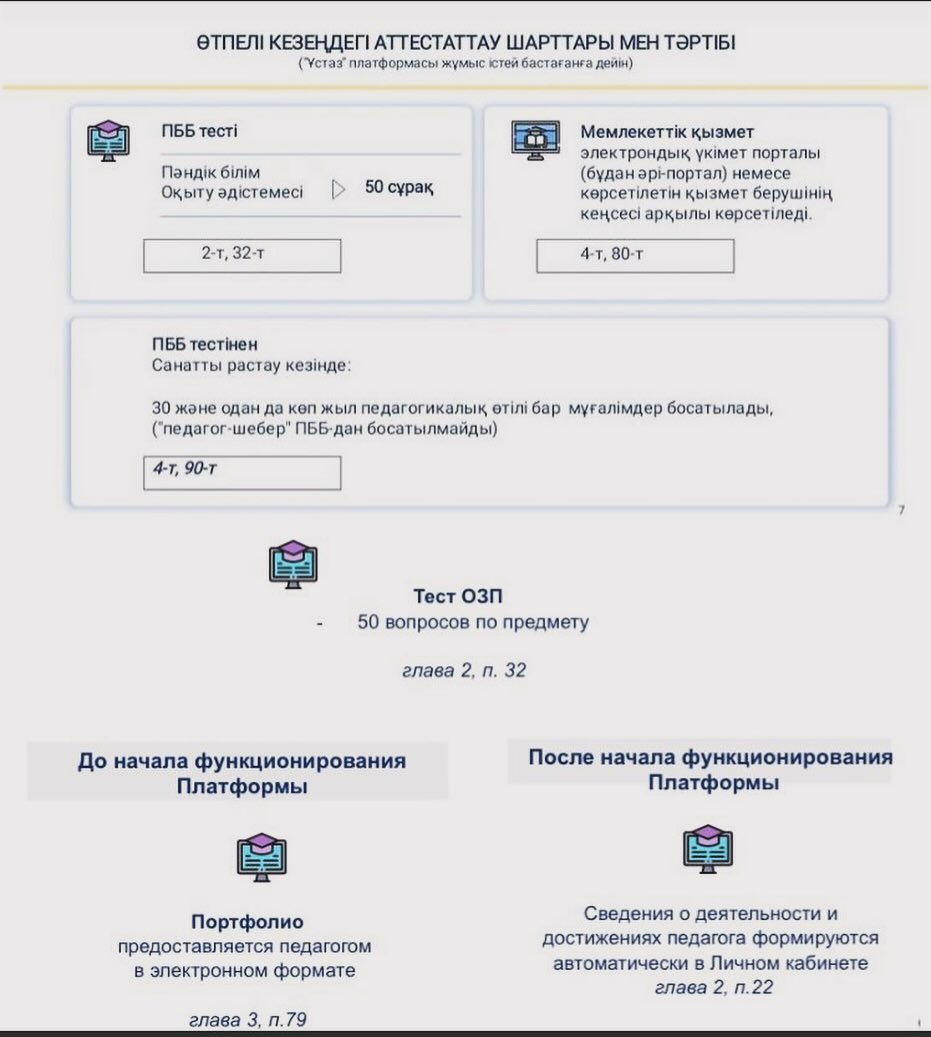 ҚР-ның Білім және ғылым министрінің 2016 жылғы 27 қаңтардағы №83 бұйрығына сәйкес Педагогтарды аттестаттаудан өткізу қағидалары мен шарттары бойынша жалпы ережелерін түсіндіру бойынша ,ҚББҰ-ның педагогтары ережені талқылап ғана қоймай,түсіндіру жұмысы барысында төмендегі сұрақтарды қойды. 1)Егер жас маман 2 жыл еңбек өтілі бар болса,1 тарау бойынша міндетті түрде ҚББҰ-ның мұғалімі болсада,ағылшын тілін білетіндігін растайтын сертификаты мен магистр академиялық дәрежесі бар дипломы болу міндеттіме? 2)Мен 2020 жылы сәуір айында ескіше екінші санатты алдым,ал менің қазіргі таңда 9 жыл еңбек өтілімім бар сонда мен келесі санат қайсыған беремін педагог-модератордан бастаймынба?әлде педагог-эспертке тапсырсам болама? 3)В 2022-2023 я перевелась из ТИПО в организацию ДО, хочу знать какую категорию могу защищать в данное время с общим пед.стажем в 23 года? 4)Мен 2021 жылы педагог-модератор санатын алдым,қазіргі таңда алғаныма 2 жыл болды соңда мен мерзімінен бұрын өткен жағдайда педагог-эксперт емес,педагог-зерттеушіге тапсыра аламынба? 5)Зейнет жасына шығуыма 2 жыл қалды,жалпы еңбек өтілімім 37 жыл 11 ай,ереженің 4 тарауы бойынша 30 жылдан көп жыл педагогикалық еңбек өтілі бар педагогтар тесттан босатылады деген.Бірақ менің портфолиам педагог-зерттеуші біліктілік санатының талаптарына сай келіп тұрса,онда мен автоматты түрде педагог-модератор санатын алмай,педагог-зерттеушіні тест тапсырып ала аламынба? 6)ЖОО-ның бітіргеннен кейін мен жұмысқа тұру үшін конкурс бойынша тест тапсырамын,ал егерде менде 5 жылдан кем емес жұмыс өтілім болса педагог-модератор санаты беріледә деген 3 ші тарау бойынша.Сонда мен екі рет тест тапсыруым керекпа?