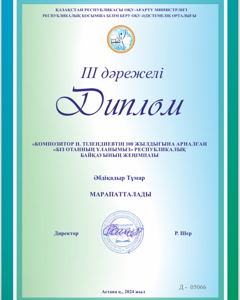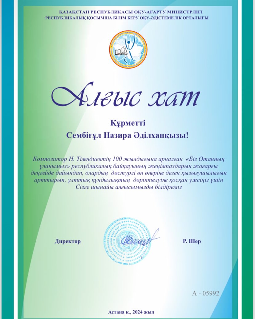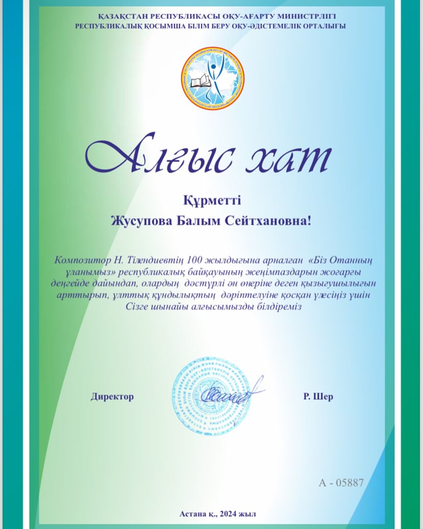 Композитор Н. Тілендиевтің 100 жылдығына арналған «Біз Отанның ұланымыз» республикалық байқауының жеңімпаздарын жоғары деңгейде дайындап, олардың дәстүрлі күй және ән өнеріне деген қызығушылығын арттырып, ұлттық құндылықтың дәріптелуіне қосқан үлестері үшін мектебіміздің мұғалімдері Жусупова Балым Сейітхановна мен Сембіғұл Назира Әділханқызы Алғыс хатпен марапатталды! Сонымен қатар, оқушыларымызды жүлделі орындарымен құттықтаймыз! Сіздерді шын жүректен құттықтай отырып, шығармашылық толағай табыстар тілейміз!