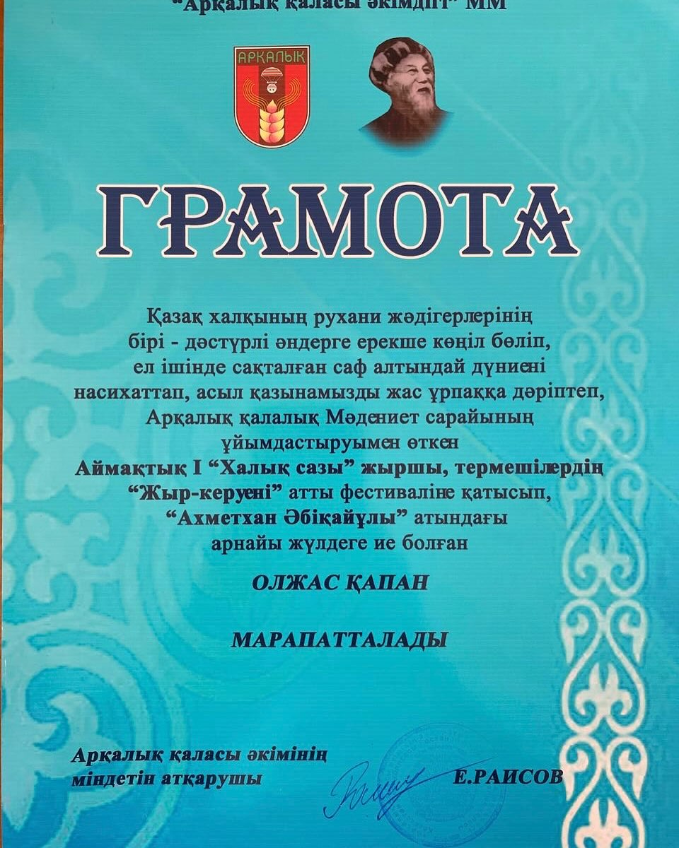 Әріптесіміз Қапан Олжас Мүшелбайұлын қазақ халқының рухани жәдігерлерінің бірі – дәстүрлі әндерге ерекше көңіл бөліп, ел ішінде сақталған саф алтындай дүниені насихаттап, асыл қазынамызды жас ұрпаққа дәріптегені үшін Арқалық қалалық Мәдениет сарайының ұйымдастыруымен өткен аймақтық I “Халық сазы” жыршы, термешілердің “Жыр-керуені” атты фестиваліне қатысып, “Ахметхан Әбіқайұлы” атындағы арнайы жүлдеге ие болуымен шын жүректен құттықтаймыз!