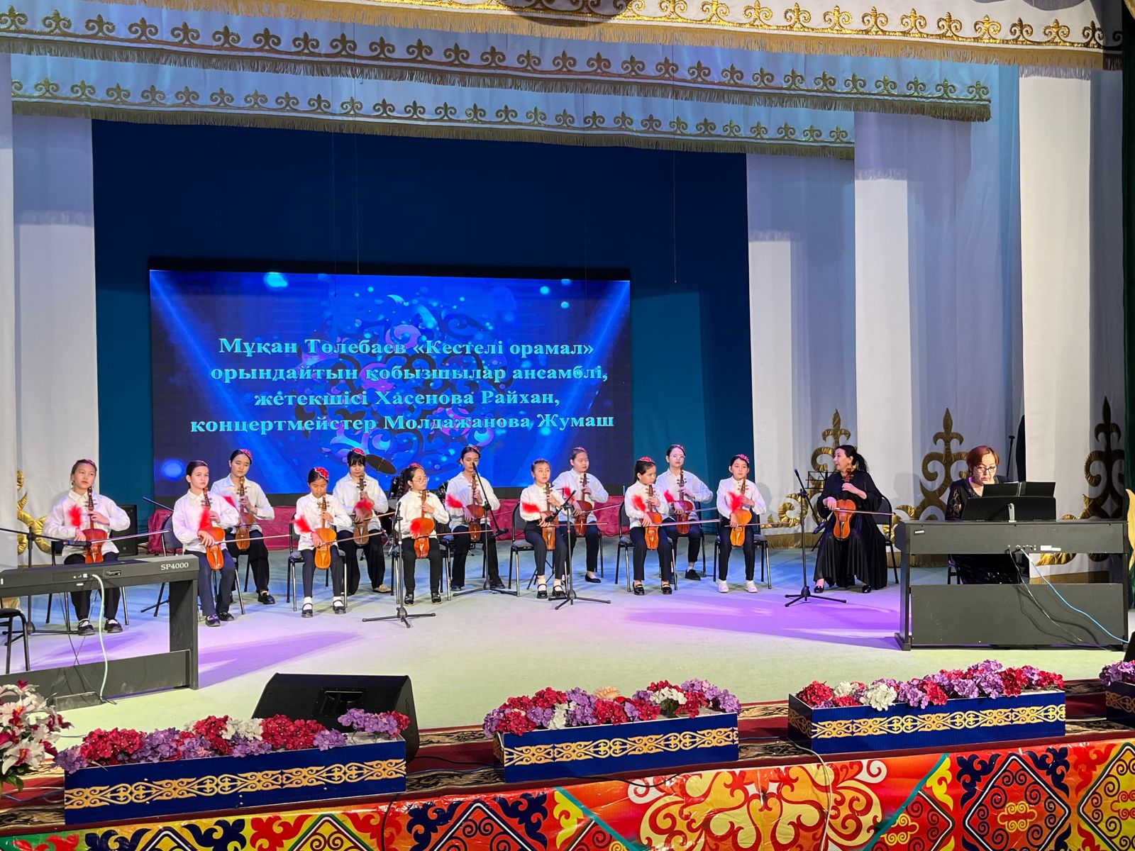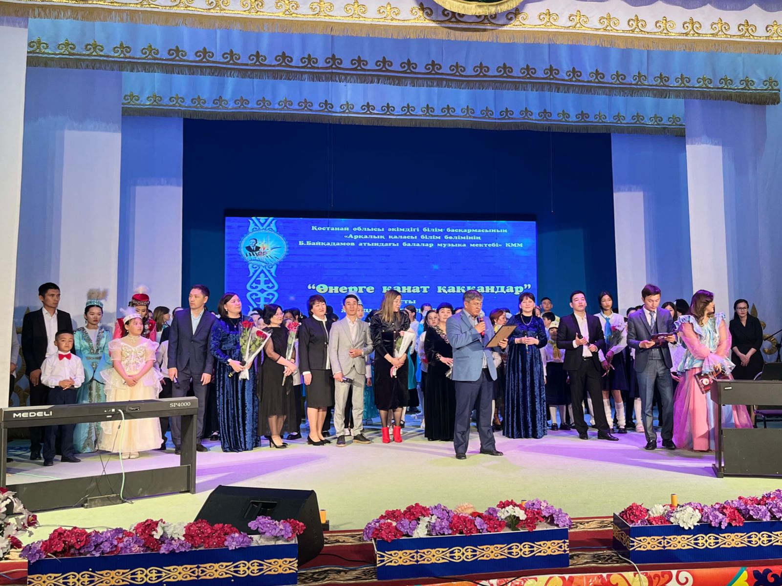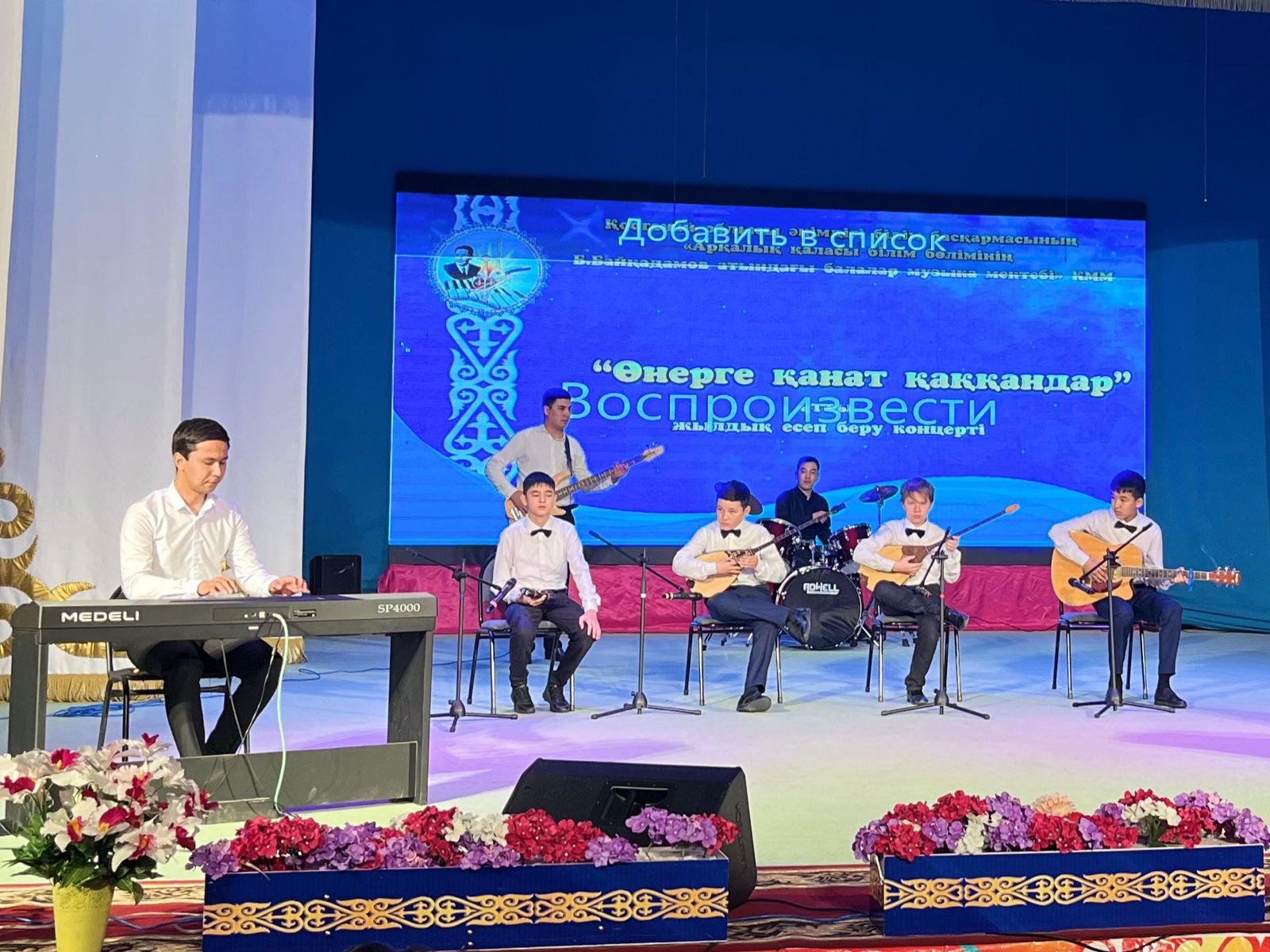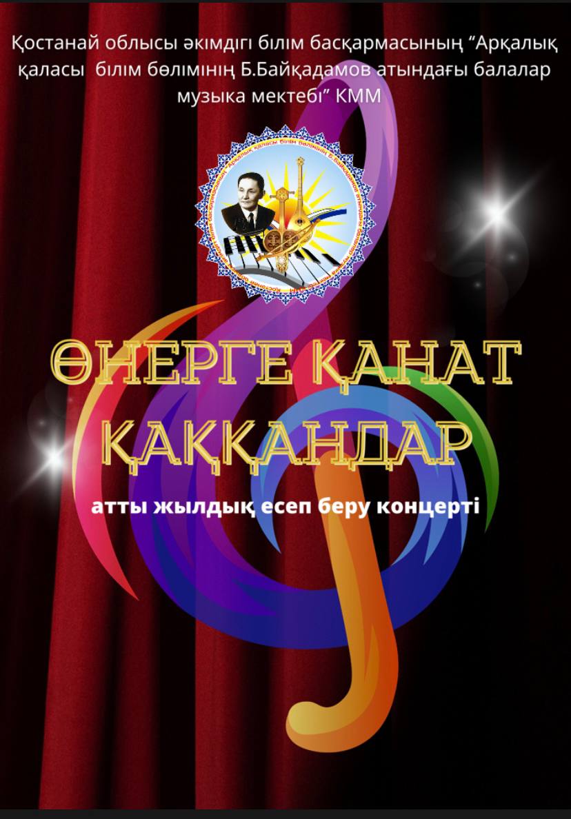 20 мамыр күні Қазақ жасөспірімдер театрында елімізде ЮНЕСКО көлемінде тойланып жатқан күй атасы - Құрманғазының 200 жылдық, ұлт ұстазы Ахмет Байтұрсыновтың 150 жылдық мерейтойға және ата-аналарға арналған облыстық «Үндестік» жобасы аясына орай мектебіміздің «Өнерге қанат қаққандар» атты жылдық есеп беру концерті өткізілді.Игі жақсылардың басын қосқан бұл концерттің алғашқы шымылдығын 80 оқушыдан құралған балалар оркестрі Құрманғазының күйі «Балбырауынды» дирижер Бөлтірікова Жақсыгүл Ибрагимқызының жетекшілігімен орындады. Концертіміз Ақанов Әділ Кәкиұлының жетекшілігімен қазақ композиторларының шығармаларынан құралған "Күй тартысқа" ұласты. Қорытынды бөлім барлық оркестр Н.Тілендиевтің «Әлқисса» күйімен тәмамдалды. Ақын аз Байтұрсынов Ахметтей, Сөзі алтын, мағынасы меруерттей дей келе А.Байтұрсыновтың «Аққұм» әнін вокал класының оқушысы, бірнеше дүркін республикалық, халықаралық байқаулардың жүлдегері Нұржайна Таубалды нақышына келтіре шырқады. Қазақстанда тұңғыш құрылған «Шертер» фольклорлы- этнографиялық ансамбльдің әншілері Сайлаубек Ордабаев пен Отаркүл Мұқатованың немерелері Томирис, Альмира және Нұрғисса Сайлаубектердің орындауында Халық күйі «Қара жорға» орындалса, болашағы көп үміт күттіретін шәкірттеріміз Аяулым, Айдана, Алихан, Адилет Абдибековтер Кармайклдің «Сердце и душа», Айтқали Жайымов «Шалқыма» орындайтын домбыра класының оқушысы, облыстық, республикалық, халықаралық байқаулардың лауреаты Қадыр Нұрәли, концертмейстер Бондаренко Римма. Құрманғазы, Тәттімбет бабамыздың, Дина анамыздың күйлерін санасына сіңірген шәкірттеріміз Ермұрат Үсеновтің «Кербез сұлу» шығармасын оқушылар халық аспаптар ансамблі Балым Жусупованың жетекшілігімен орындап берді. Домбыра, қобыз, сені ойнатамын,Толғау сап, төңіректі ойлатамын дей келе, Мұқан Төлебаевтың «Кестелі орамал» туындысын қобызшылар ансамблі Райхан Хасенова мен концертмейстер Жумаш Молдажанованың жетекшілігімен орындап, көрерменнің ыстық ілтипатына бөленді. Мектебіміздің ең жас күйші қыздарының орындауында халық күйі «Нәр ағашы» Б.Жусуповның жетекшілігімен. Абдулхамит Райымбергеновтың шығармасы «Секіртпе» Әсел Кәрібаеваның жетекшілігімен домбырашылар ансамблі қоңыр домбыраның күмбіріне бөледі. Көптің көңілінен шыққан концертіміз орындайтын шәкіртіміз Назым Алтынбаеваның орындауында, Жумаш Молдажанованың күйсандықта сүйемелдеуімен халық әні «Дайдидаумен» жалғасты. Дәстүрлі ән класынан құралған дуэт халық әні «Үш меркі» әнін тарту етті. Роза Газизованың жетекшілігімен аккордеоншыларымыз да қалыс қалмай, Шуберттің «Экосез» туындысын орындап берді.Вокалдық ансамбль жетекшісі Гүлнұр Баяхметованың орындауында ешқашан ескірмейтін «Қазақ әндерінен попурри» орындалды. Марат Бердіғұловтың «Ақсауыт» шығармасы жетекшісі Ә.Ақановтың «Арқа сазы» ұлт аспаптар ансамблінің орындауында көпшіліктің құрметіне бөленді. Шәмші Қалдаяқовтың «Теріскей» әнін О.Қапан нақышына келтіре шырқады.Денеңді шымырлатып, толқытатын, Мәңгілік басымды ием, өнерге мен демекші, Т.Мұханбетжанов «Детство» шығармасы С.Шайхин жетекшілік ететін БЭНД Байқадамов. Карл Дженкинс "Палладио" орындайтын ансамбль жетекшісі Райхан Хасенова. «Я люблю кофе» орындайтын бірінші сынып оқушылары, жетекшісі Молдажанова Жумаш. Алтынайдың күйі «Ақжелең» орындайты